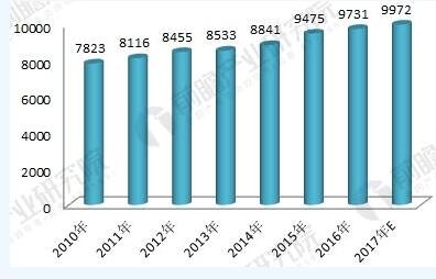 圖表2:2010-2017年中國餐廚垃圾產(chǎn)生量規(guī)模趨勢圖(單位:萬噸,%)