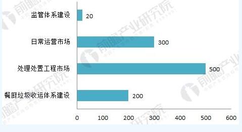 根據(jù)前瞻產(chǎn)業(yè)研究院發(fā)布的《2018-2023年中國餐廚垃圾處理行業(yè)發(fā)展前景預(yù)測與投資戰(zhàn)略規(guī)劃分析報告》預(yù)計,“十三五”期間整個餐廚垃圾總體市場空間可達(dá)1000-1500億元。其中餐廚垃圾收運(yùn)體系建設(shè)約需200億(收運(yùn)體系其中包括垃圾容器、車輛,包括車輛和垃圾容器之間的銜接)、處理處置工程市場約需500-1000億、日常運(yùn)營市場大約是300億、監(jiān)管體系建設(shè)大約能形成20億左右的市場規(guī)模。