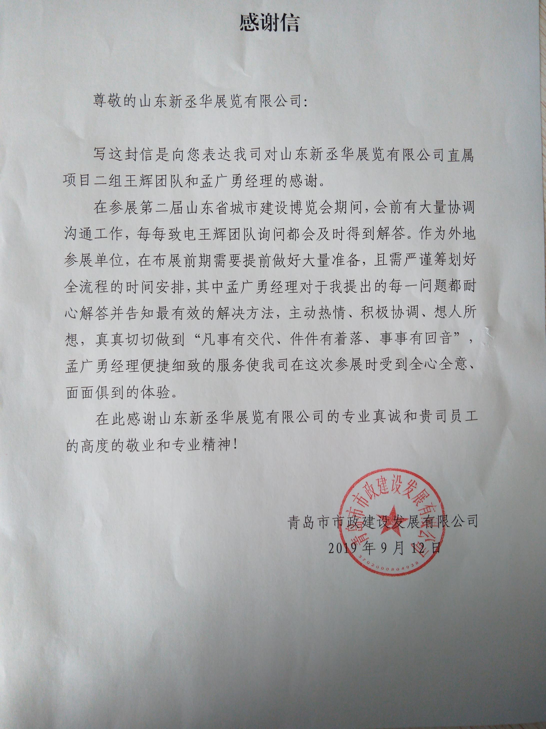 寫這封信是向您表達我司對山東新丞華展覽有限公司直屬項目二組王輝團隊和孟廣勇經理的感謝。