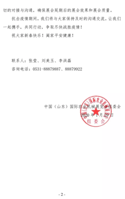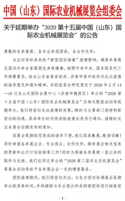 為應對突如其來的“新型冠狀病毒”疫情影響,確保參展商及國內外參會客商朋友身體健康,按照中共中央、國務院系列工作部署要求,結合山東省委省政府、濟南市委市政府對此次疫情的指導意見和通知精神,并經組委會研究原定于 2020 年 2 月 14—16 日在山東國際會展中心(濟南市槐蔭區(qū))舉辦的“2020 第十五屆中國(山東)國際農業(yè)機械展覽會”及相關配套活動將延 期舉辦。我們將密切關注疫情的發(fā)展,隨時與主管部門保持積極 密切的溝通,具體舉辦時間待消除疫情后將另行通知,請隨時關 注本展會后期發(fā)布的通知。