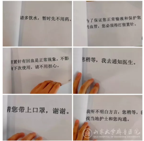 在臨床工作實戰(zhàn)中,我發(fā)現(xiàn)我們山東醫(yī)療隊和湖北當?shù)氐幕颊哌M行溝通存在障礙,因為湖北黃岡方言很重,而且南方方言和我們北方話差異很大,有時候我說的患者不明白,患者說的我聽不懂,在這樣的情況下,我?guī)椭t(yī)療隊,初步制訂了大別山區(qū)域醫(yī)療中心護患溝通本(山東醫(yī)療隊),里面有我們平時工作中和患者交流比較多的問題的簡易回答,在語言不通時,我們拿出護患溝通本,患者看到文字,就能理解。我們計劃隨著工作的慢慢進展再一步步慢慢修訂護患溝通本。