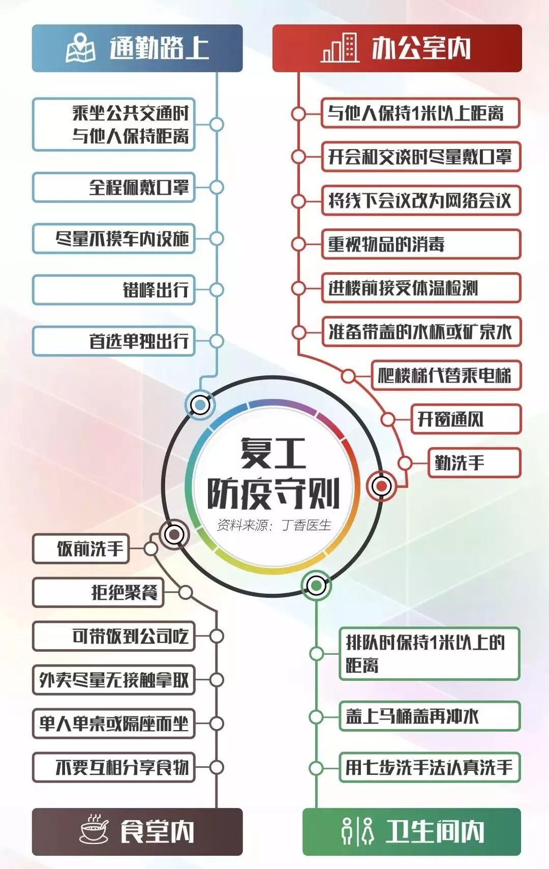 本周,不少人已開啟節(jié)后復(fù)工模式 通勤路上如何防護? 辦公室里要注意哪些細節(jié)? 在食堂用餐應(yīng)規(guī)避哪些風(fēng)險? 收好下面這份復(fù)工防疫守則 關(guān)鍵信息一目了然↓↓↓